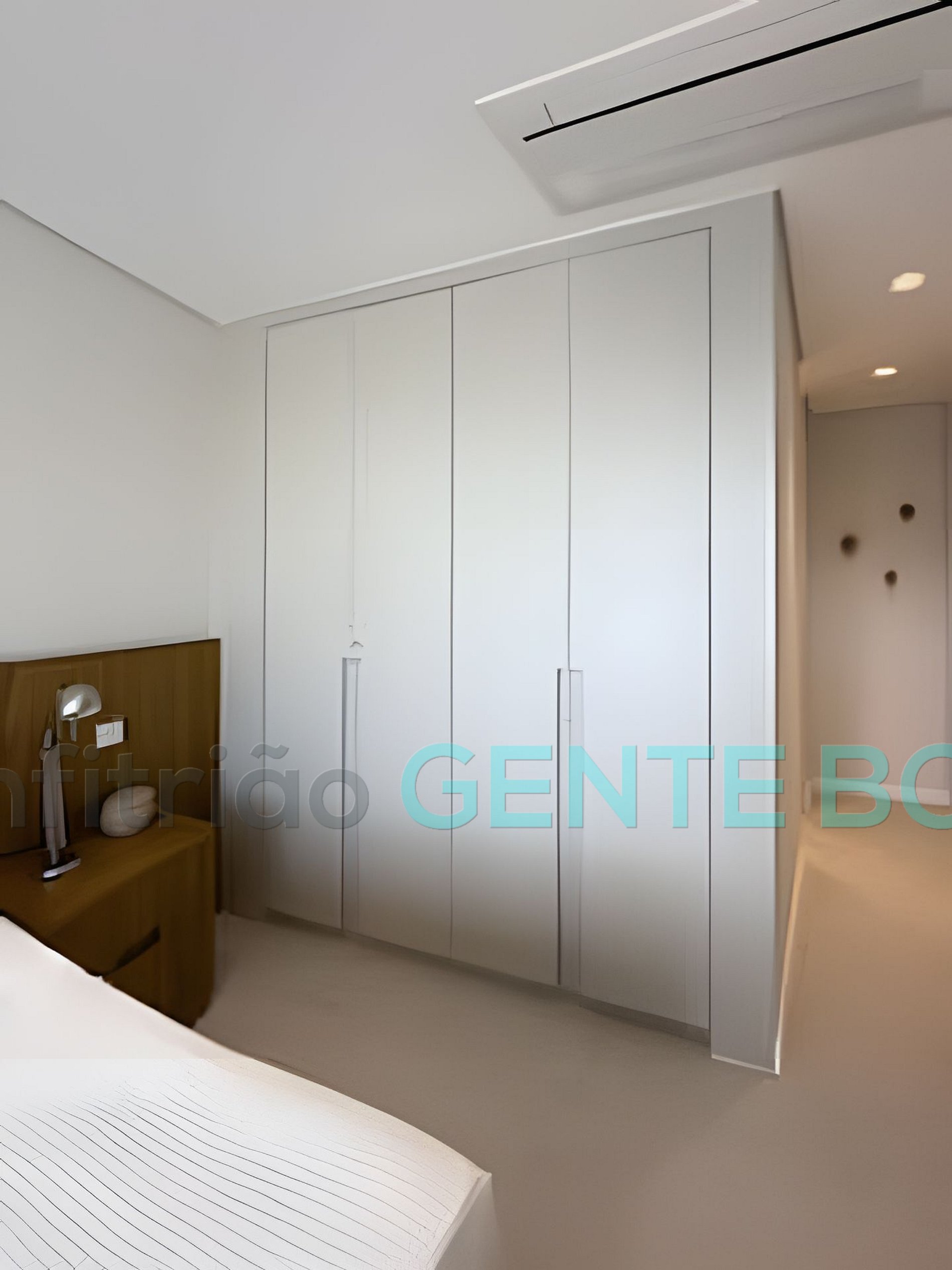 Suíte 01 com cama de casal, closet, ar-condicionado, banheiro privativo, cortina black out.