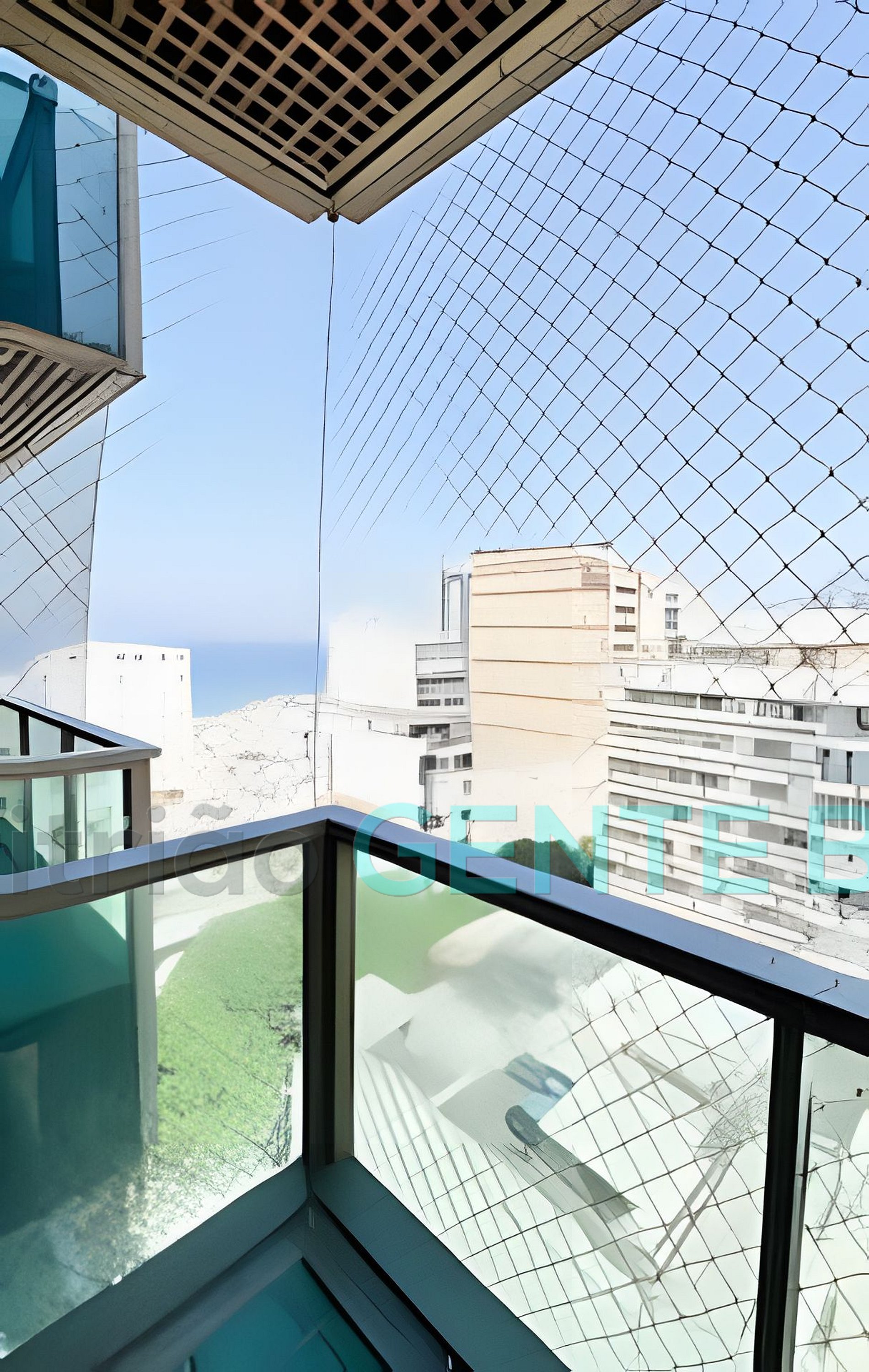 2 varandas com linda vista com mesa, cadeiras e rede de proteção para crianças.
