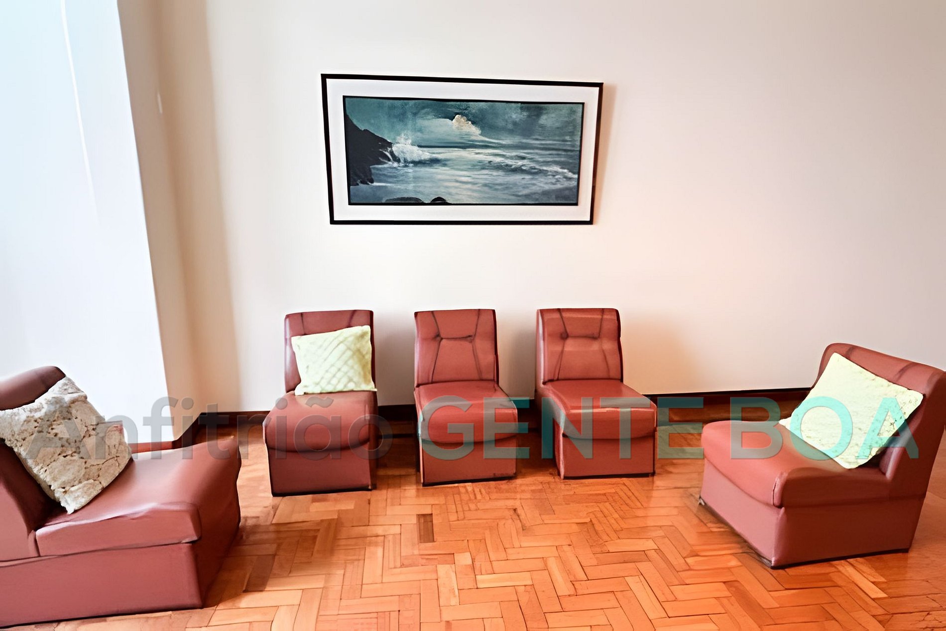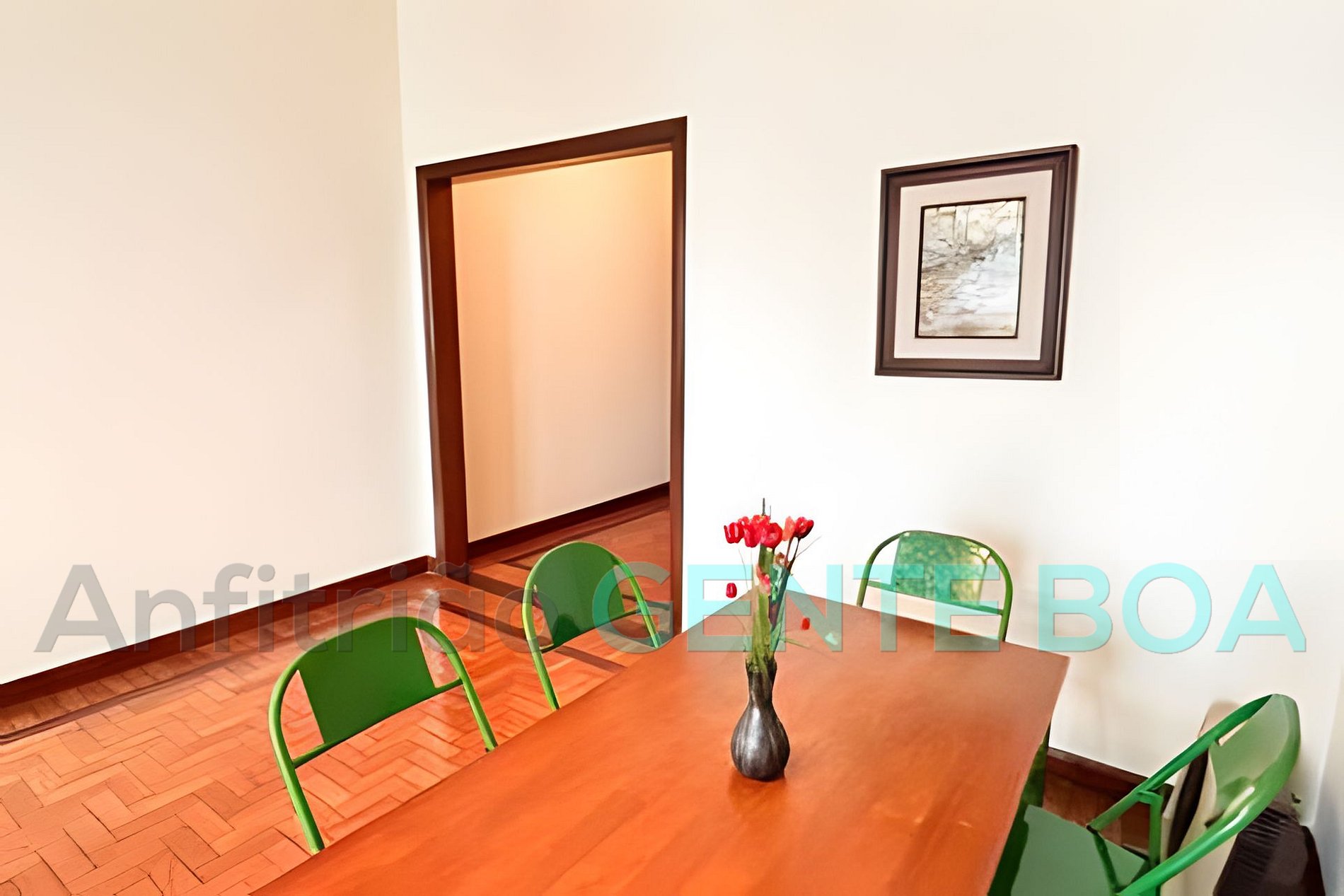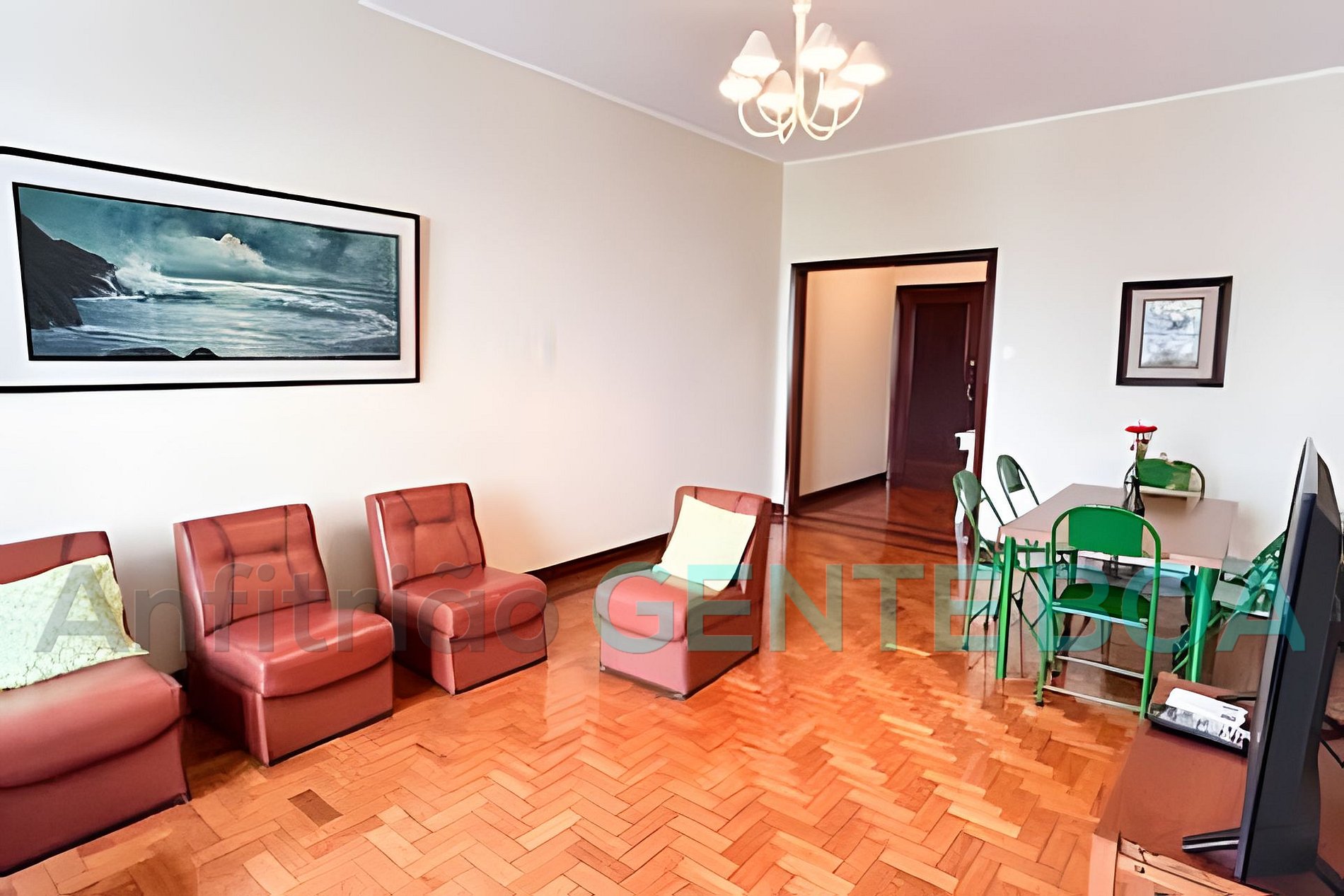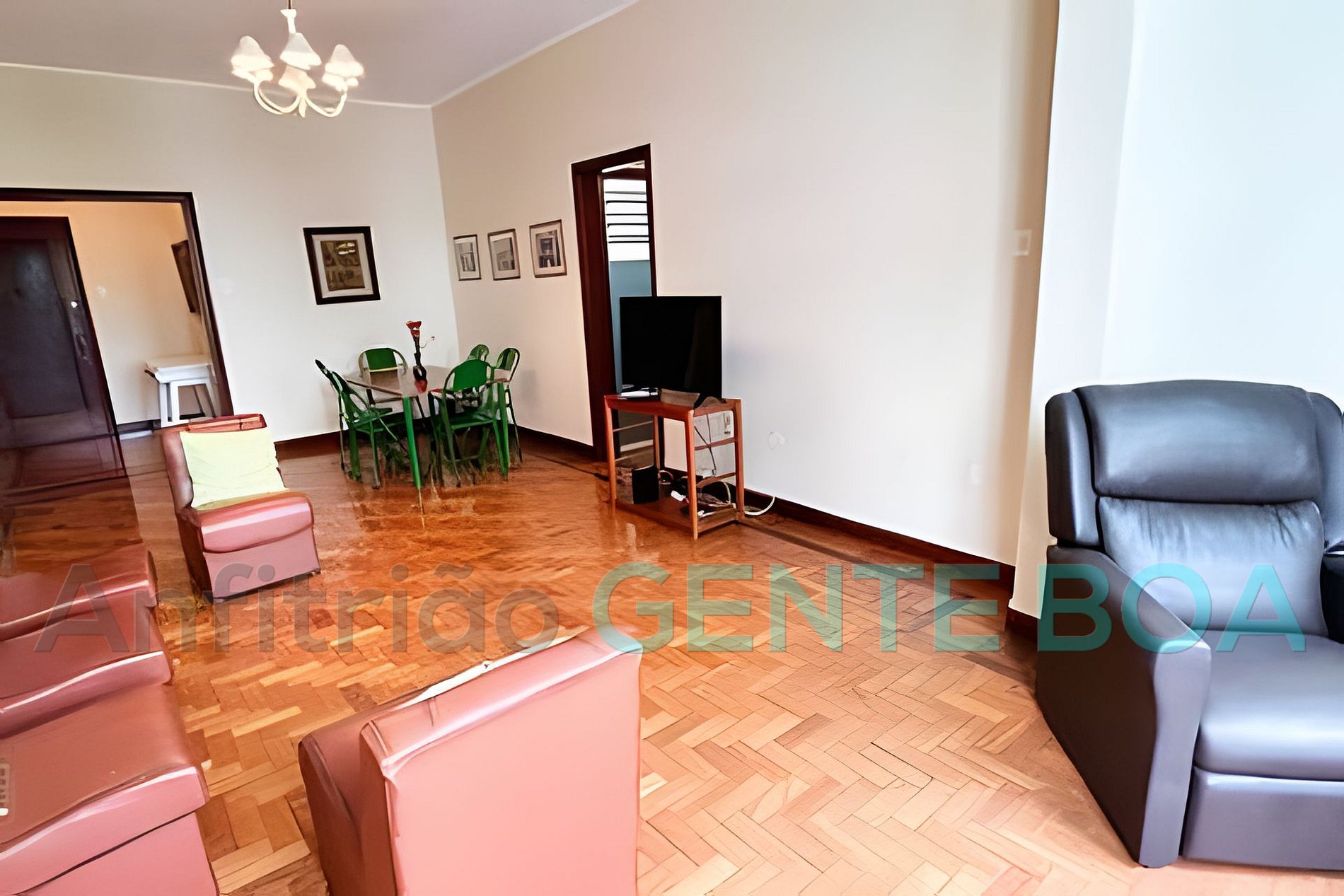 Sala em dois ambientes, janelão, poltronas, smartv, internet, mesa de jantar.