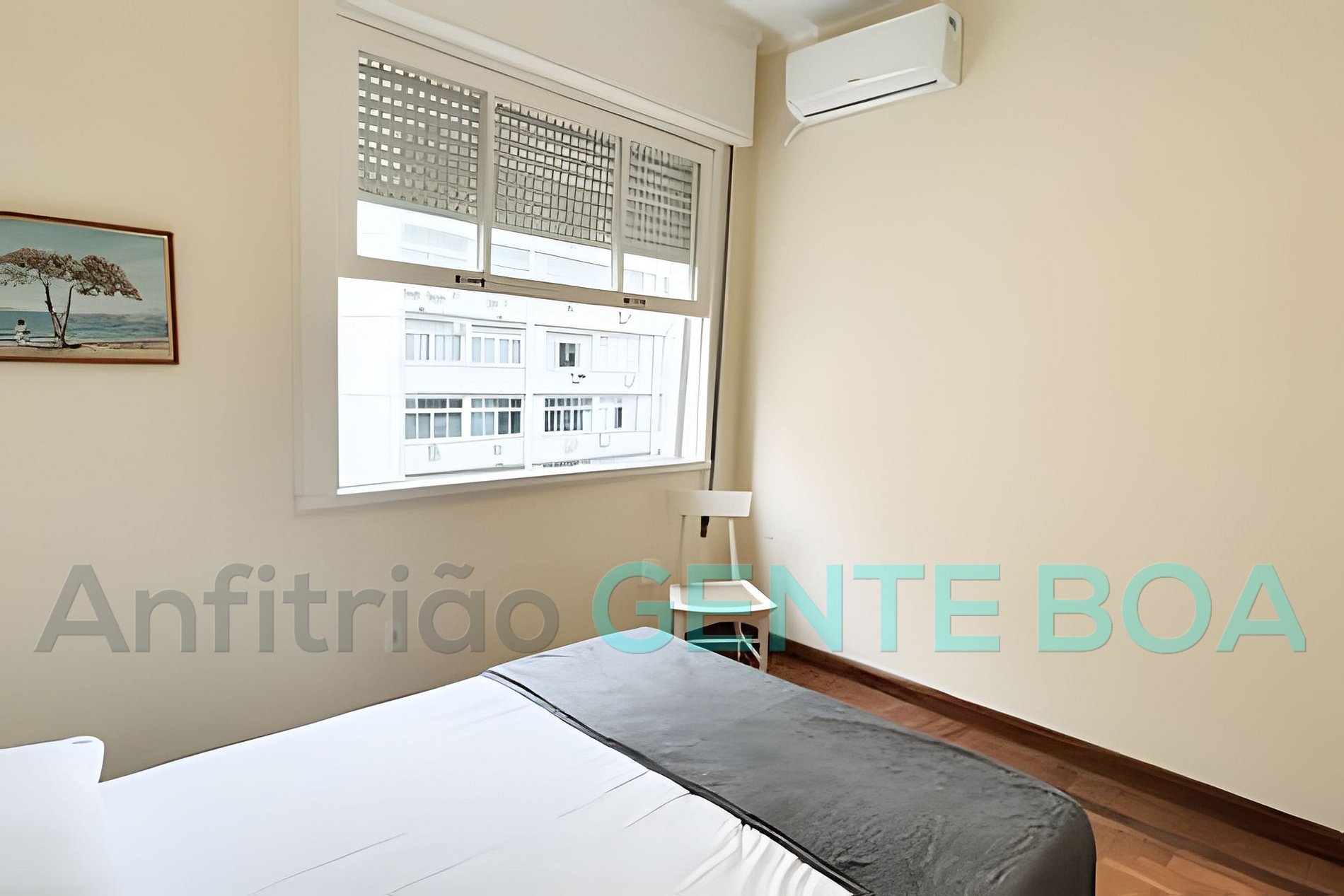 Três bons quartos, com ar-condicionado, dois deles com cama de casal e um com duas cama de solteiros.
