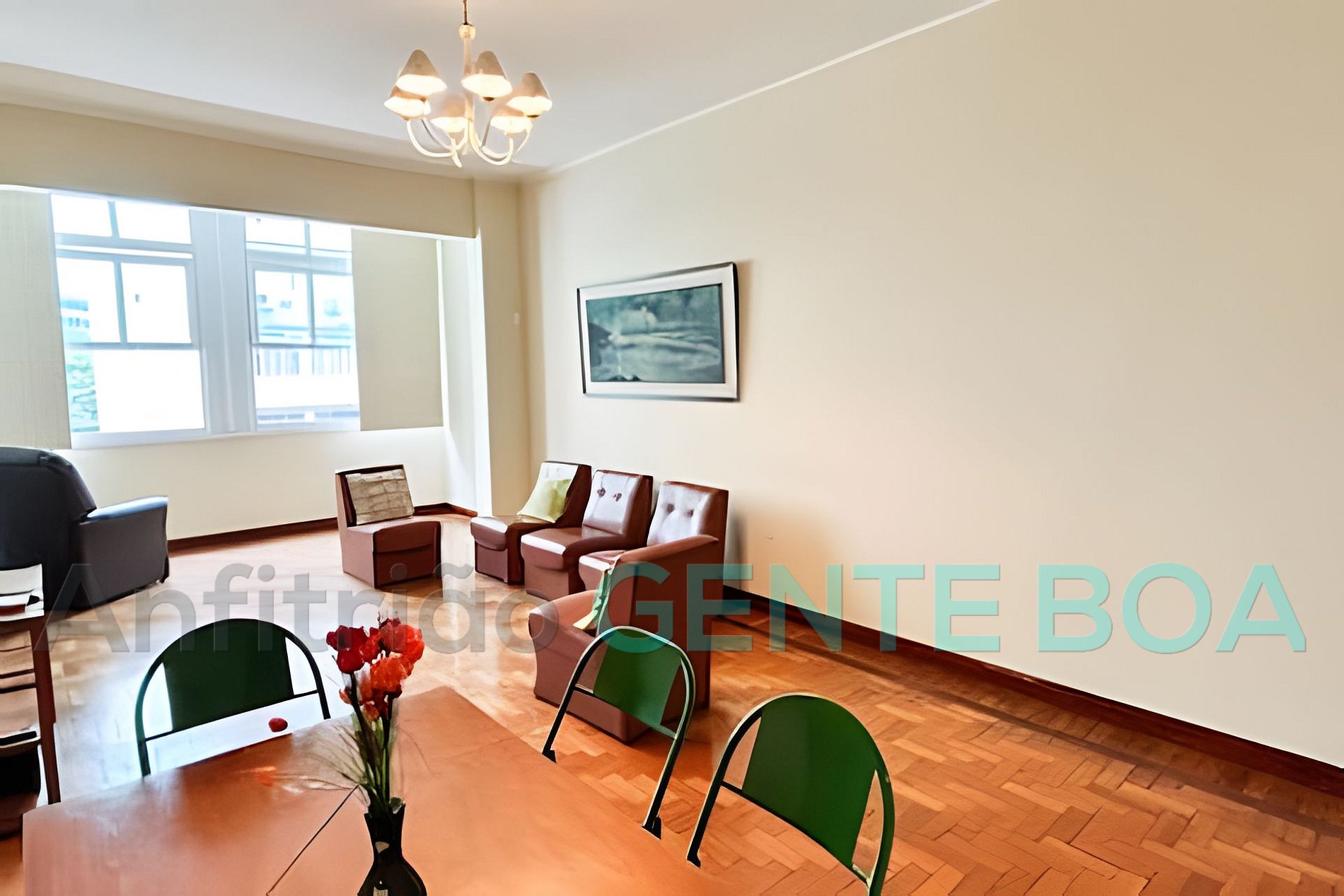Sala em dois ambientes, janelão, poltronas, smartv, internet, mesa de jantar.