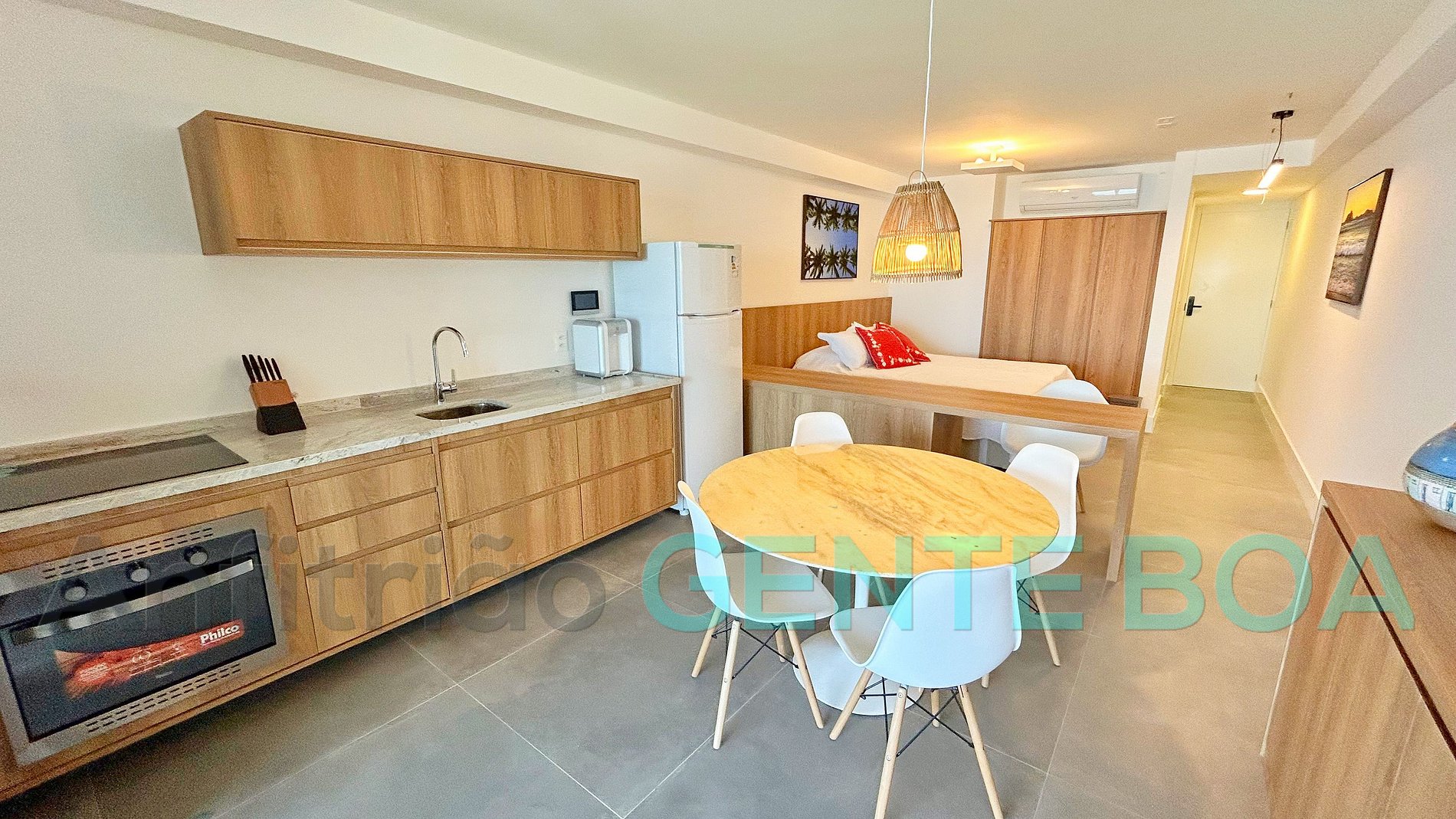 Decorado, confortável, climatizado, funcional, varanda, cortinas de vidro, internet, cama queen, sofá cama americano, mesa de jantar, cozinha aberta, equipada, banheiro social, box blindex, maquina de lavar/secar.