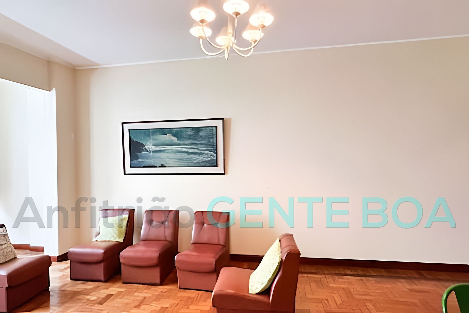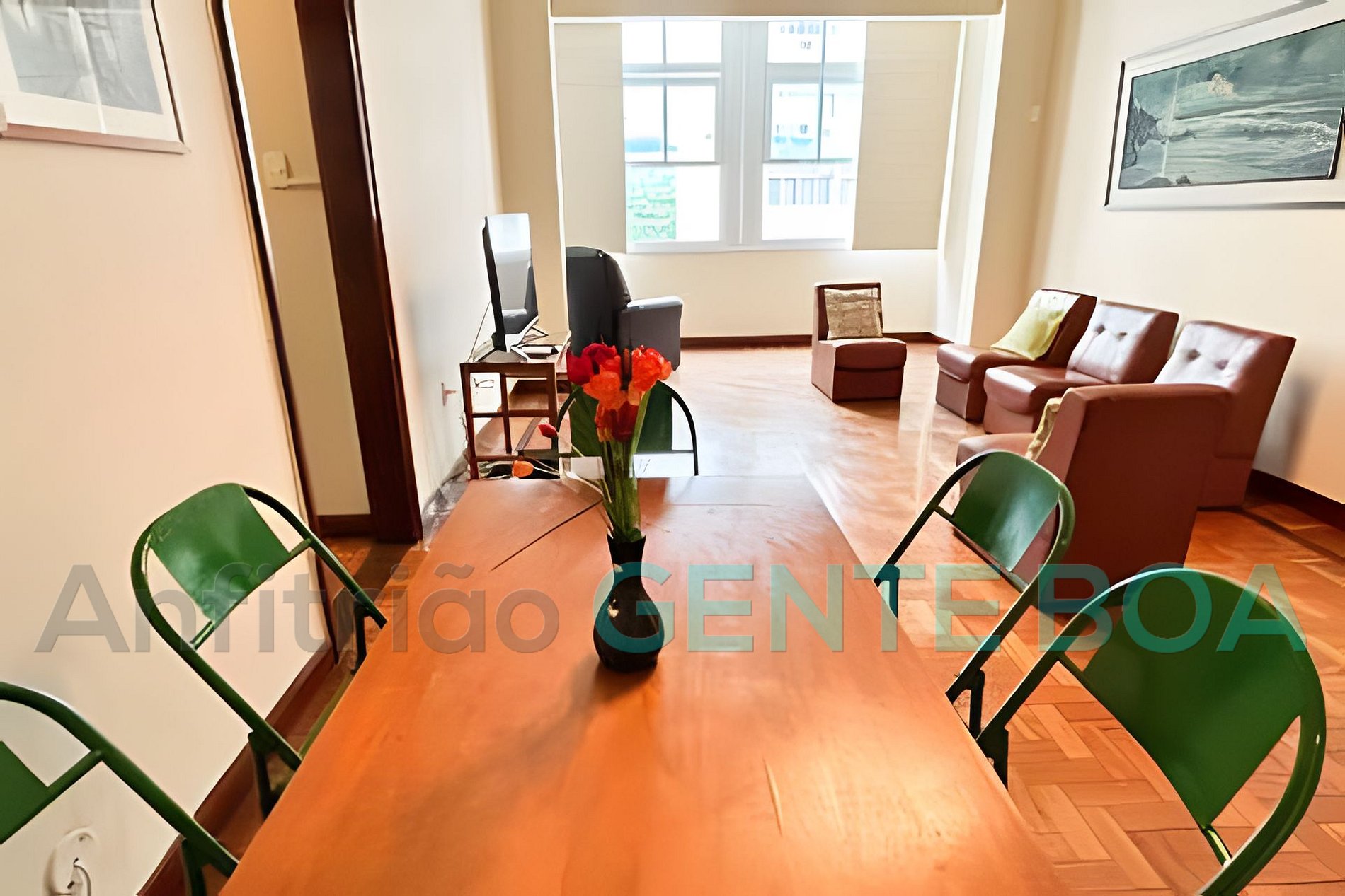 Sala em dois ambientes, janelão, poltronas, smartv, internet, mesa de jantar.